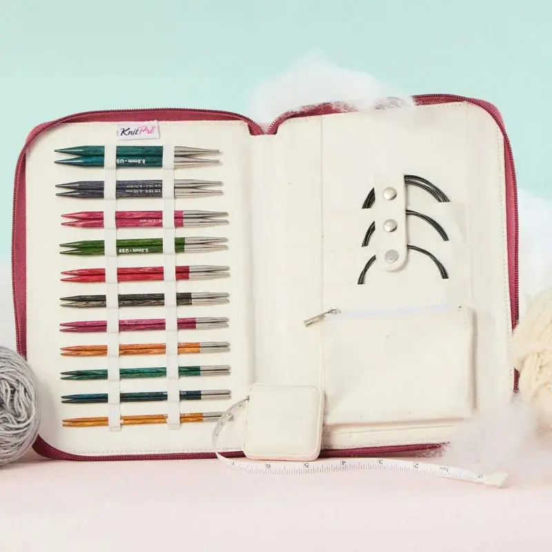 The Dreamz Needle Sets with 13cm (5") interchangeable circular knitting needles are thoughtfully designed with knitting comfort in mind. The smooth and lightweight interchangeable circular needle tips crafted from high-quality birchwood ensure effortless stitches and are color-coded according to size for easy identification. The smooth join does not snag, and the nylon-coated stainless-steel cables lie flat to prevent twisting. Whether you're a seasoned knitter or just starting out, these interchangeable circular needle sets packed in handy Bordeaux fabric cases provide the tools you need to create beautiful projects in complete comfort.