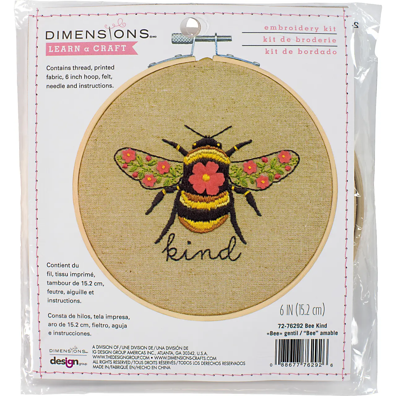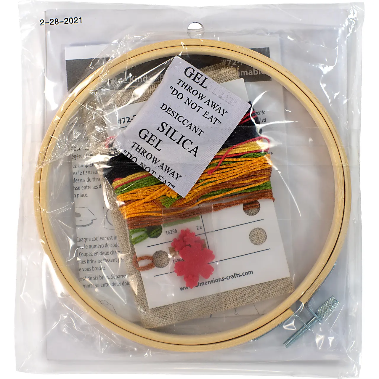 The kit contains: instruction chart in English, color symbol pattern, printed embroidery cloth (linen), cotton mouline Dimensions, bamboo hoop and needle.