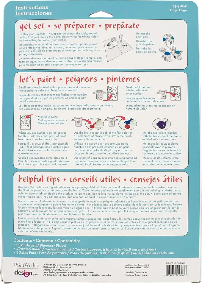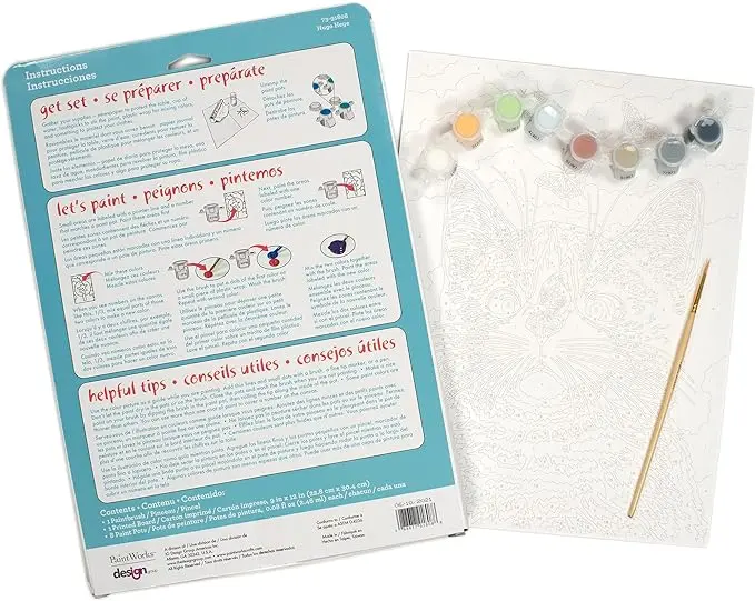 The Paint by Number Kit includes high-quality acrylic paints, cardboard, a #1 round brush and instructions.