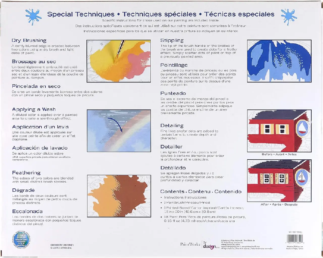 The set includes high-quality acrylic paints, printing cardboard, round brush #1 and instructions.