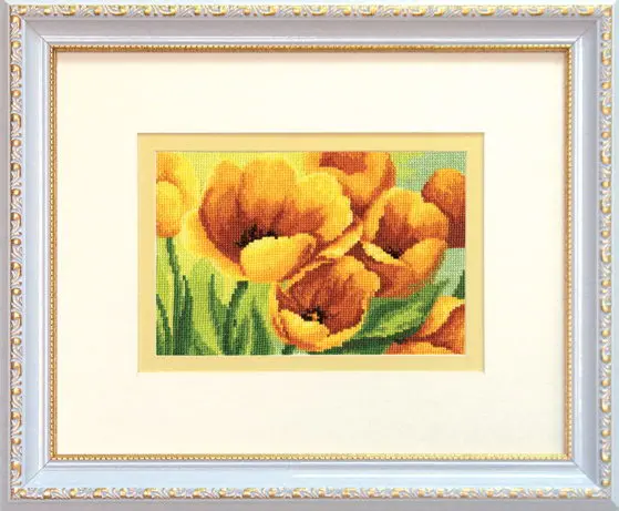 The kit contains: color cross stitch pattern, Aida 16, cotton embroidery threads and a needle.