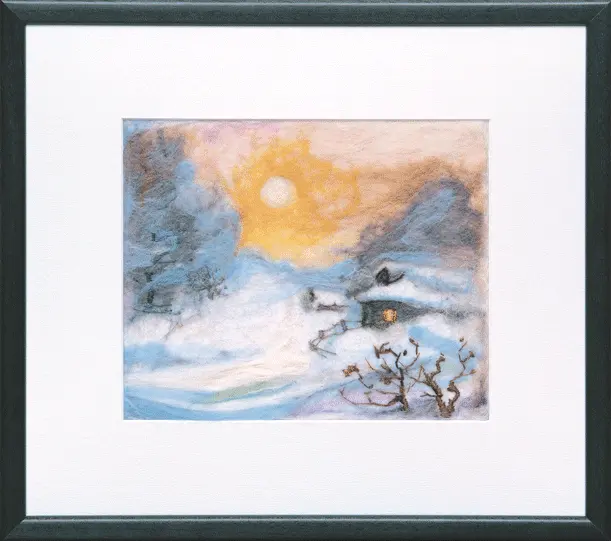 The kit contains: color pattern, instruction chart, Corriedale wool - 14 colors, felting needles - 2 pieces, mouline Madeira - 10 colors, felt (basis).