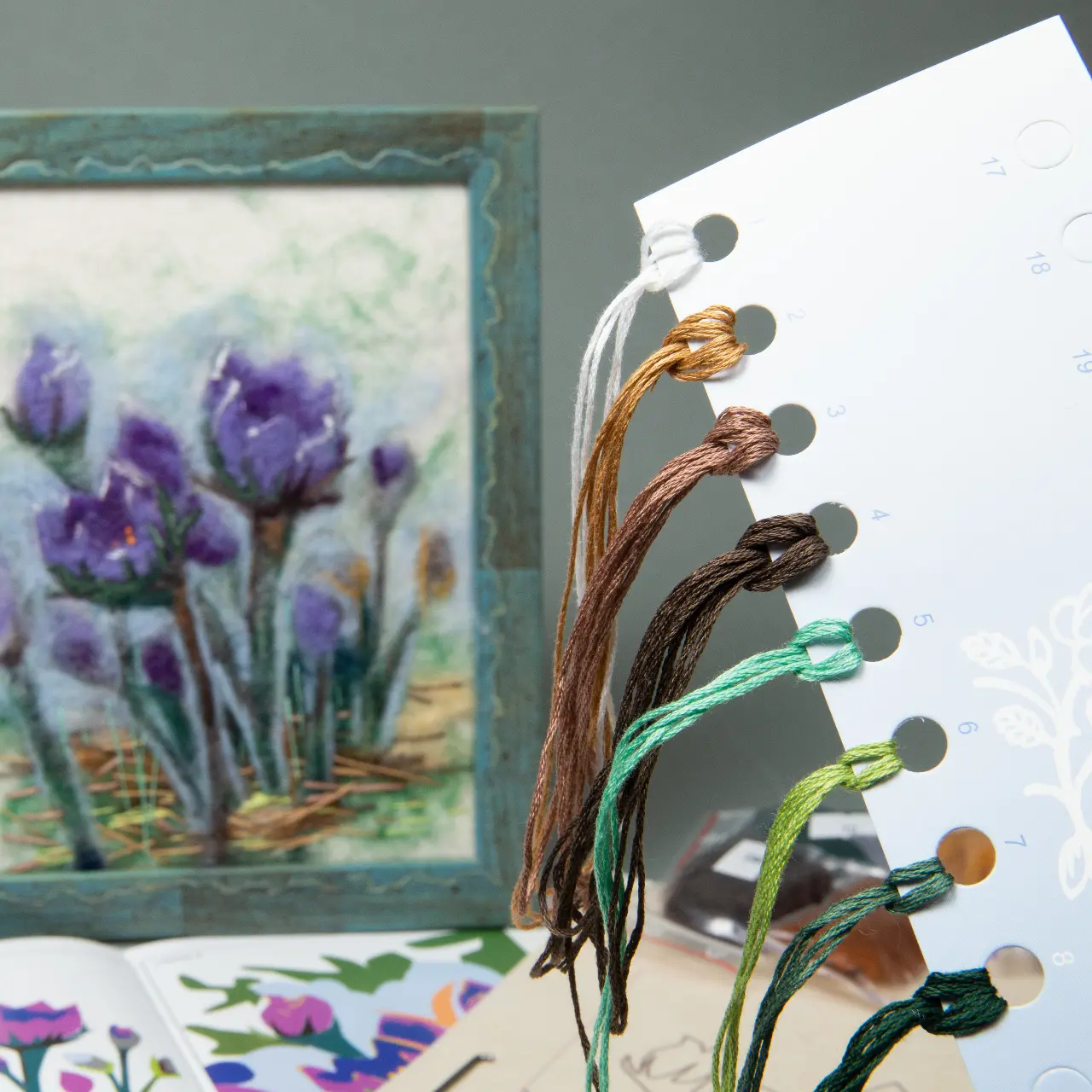 The kit contains: color pattern, instruction chart, Corriedale wool – 12 colors, felting needles – 2 pieces, Preciosa beads of 1 color, mouline Madeira – 8 colors, felt (basis).