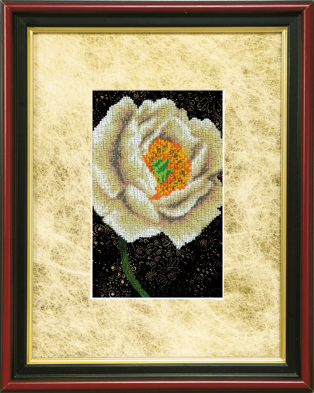 The kit contains: instruction chart, color pattern, printed embroidery cloth, Preciosa beads - 13 colors and a beaded needle.
