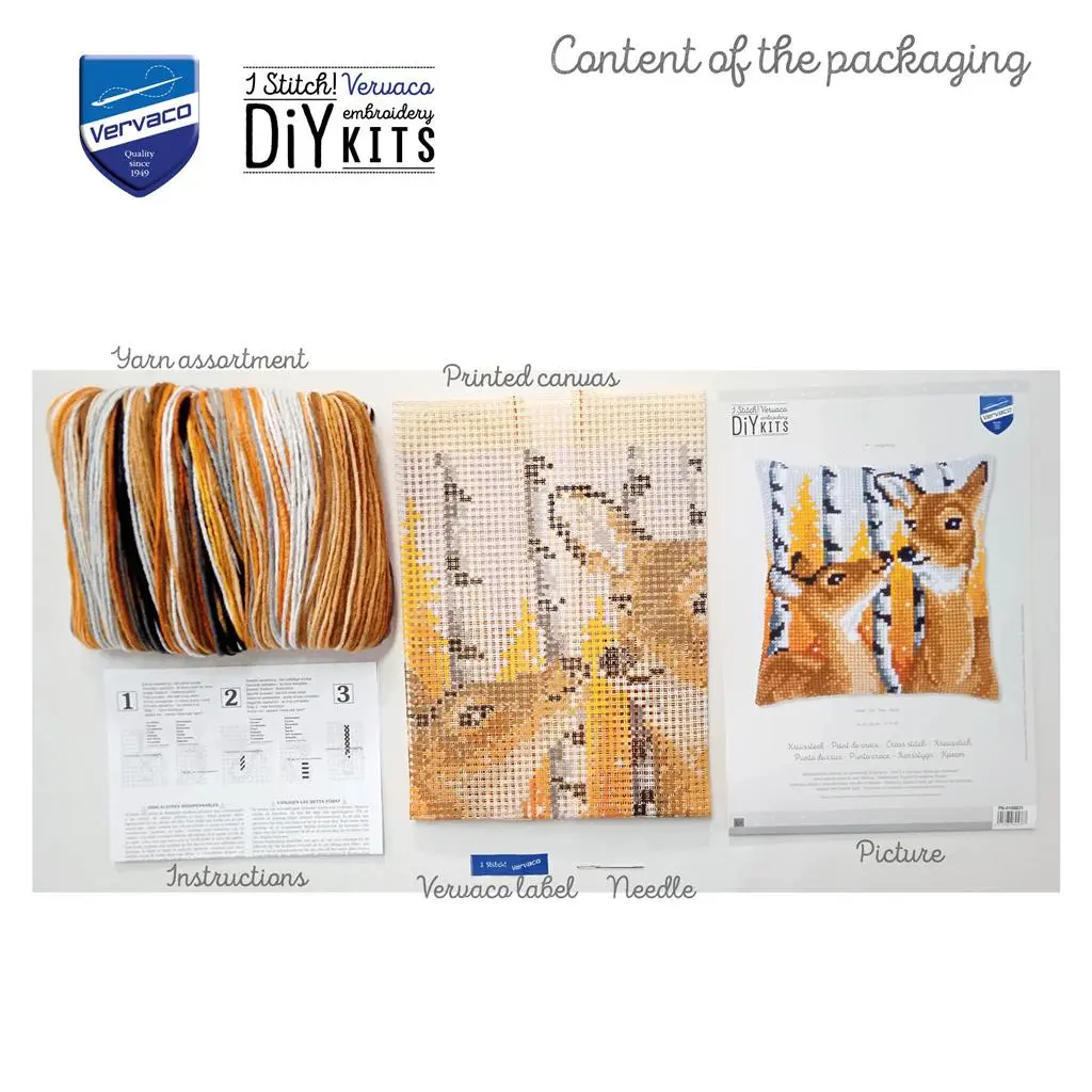 Vervaco products are characterized by high Belgian quality. The kit includes high-quality materials: hand-dyed 100% cotton stramine (count: 18 /10 cm - 4.5 stitches), thick yarn 100% acrylic, clear working instructions, a needle. A large full-color image of the finished model and a color scheme.