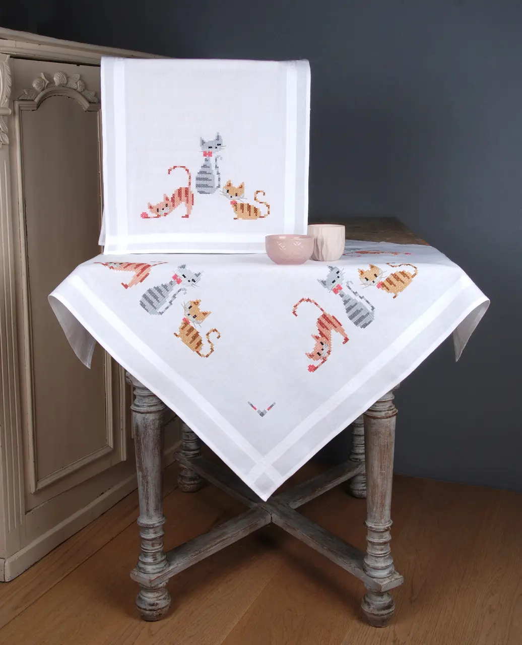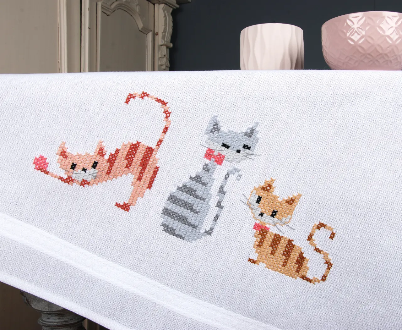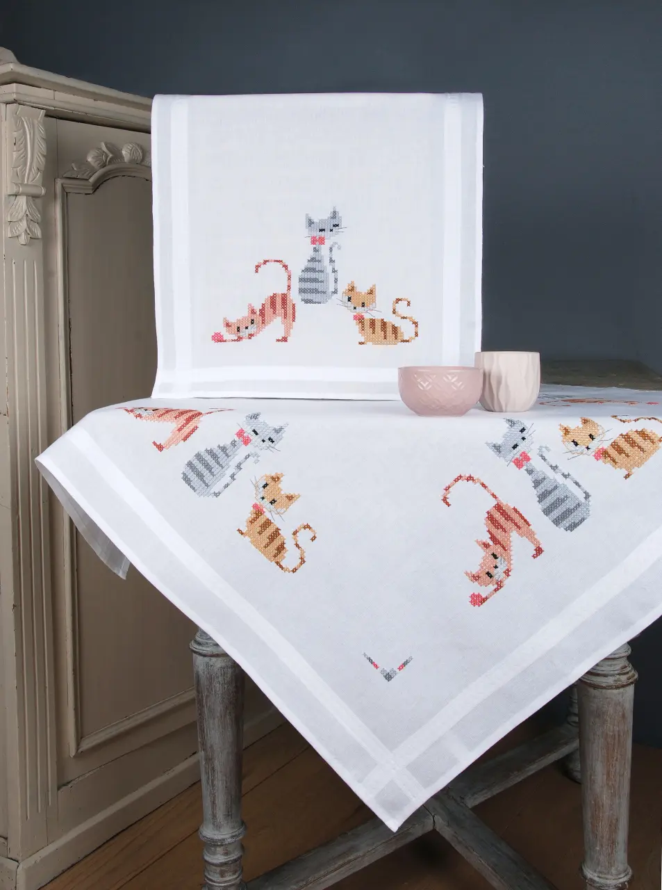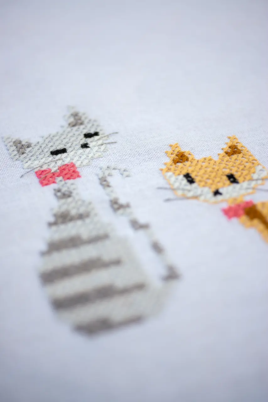 The kit contains: instruction chart, symbol pattern, printed embroidery cloth of white color (washable), cotton mouline DMC - 9 colors and a needle.
