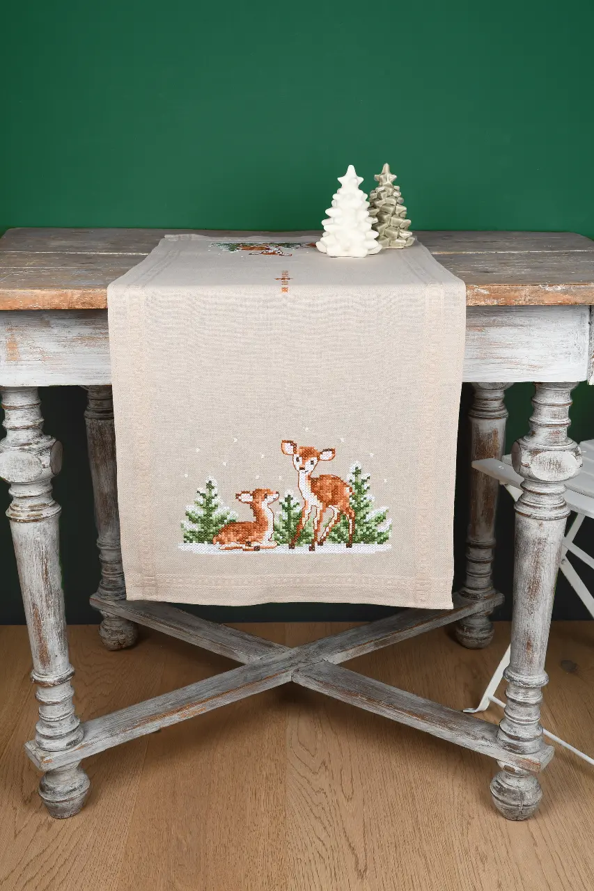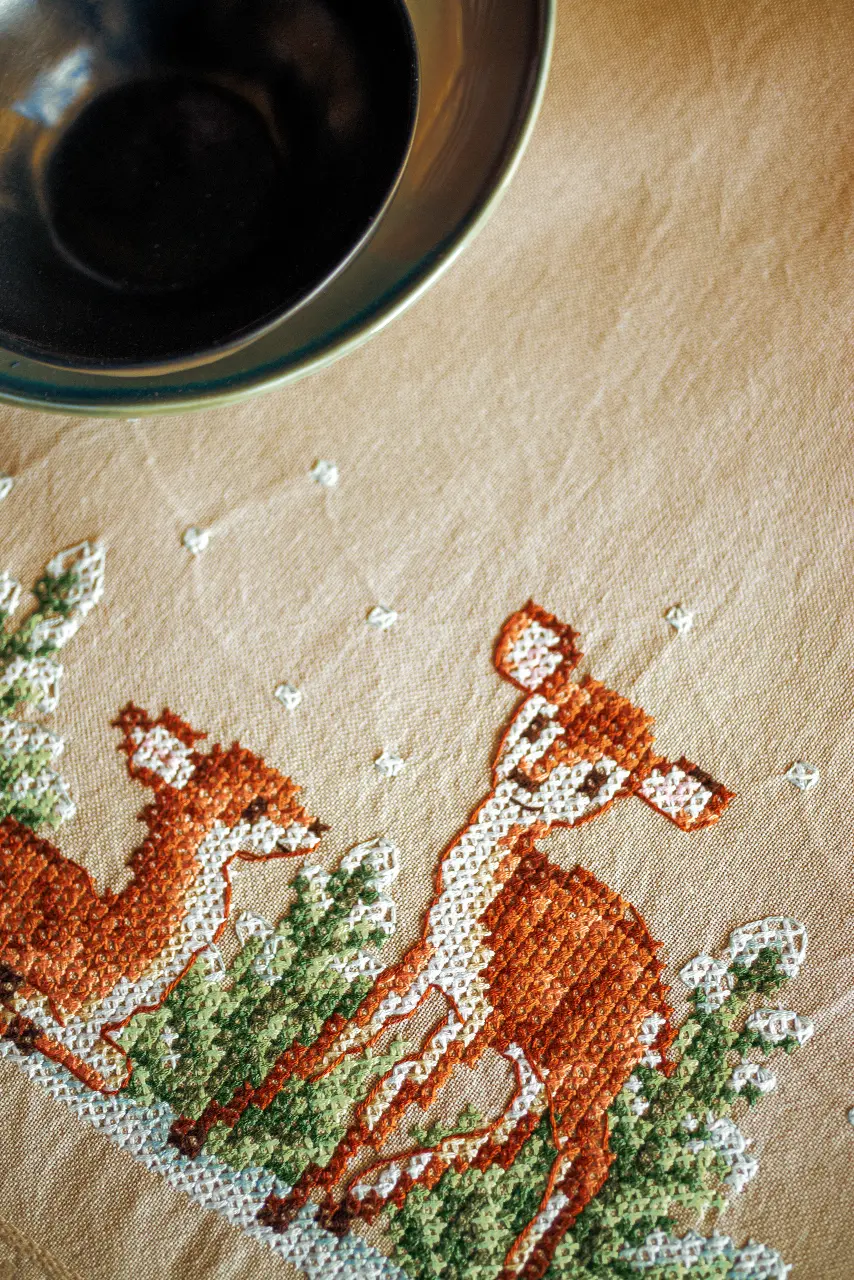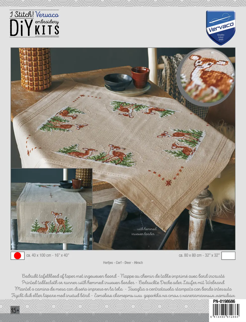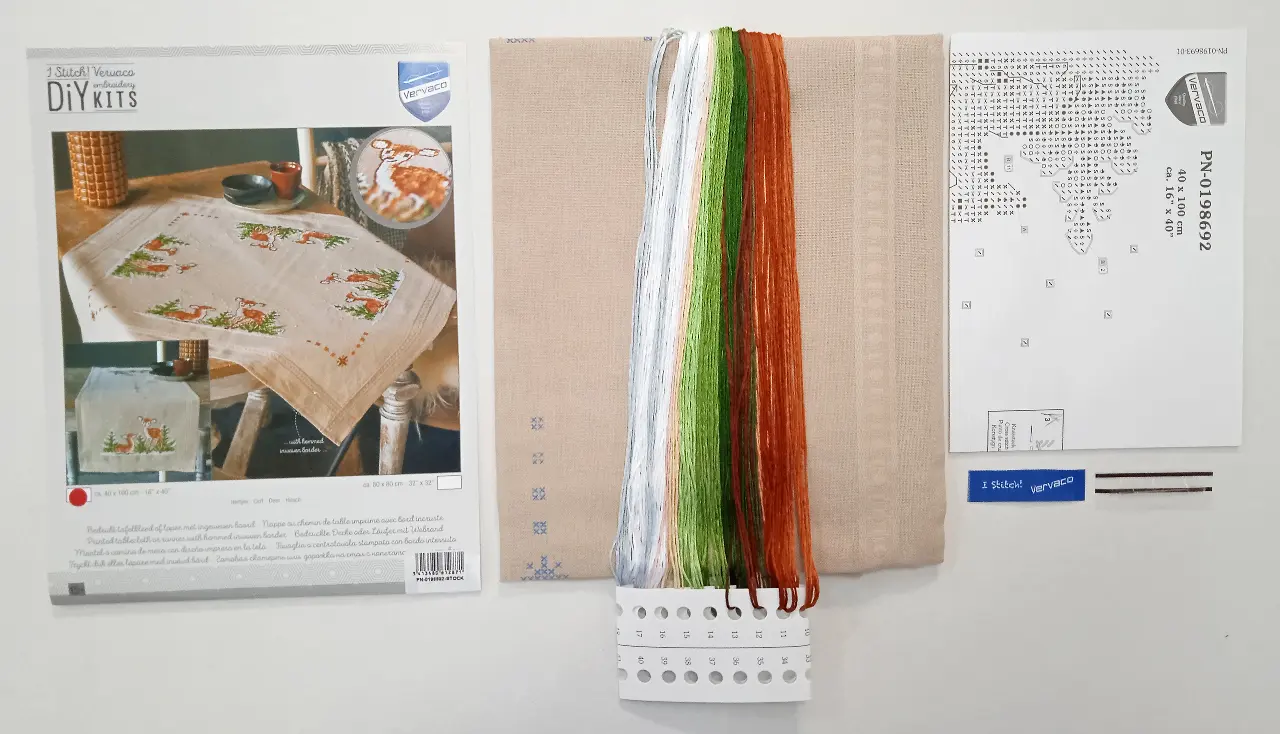 The kit contains: instruction chart, symbol pattern, printed embroidery cloth (washable), cotton mouline DMC and a needle.